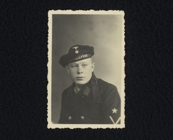 Editor: So, this is "Portrait of an Unknown Young Man in Military Uniform," a photograph potentially taken between 1913 and 1916 by the American Automatic Photo Cy. The starkness of the monochrome and the formal pose create a feeling of melancholy. What compositional elements stand out to you? Curator: Immediately, the frontal pose demands attention. Its symmetry, anchored by the rigid collar and hat, is then cleverly offset by the slight turn of the subject’s head. Note how this small shift animates the gaze, preventing it from becoming a flat, unemotional record. The success of this piece, though its author is unknown, arises from the interplay between rigid structure and subtle inflection. Editor: I hadn't considered how that slight turn enlivens it. What about the visible text on the edges? "Hagenstraat?" Curator: Precisely. The text framing the image operates on multiple levels. Firstly, as a visual signifier of place—Hagenstraat. But structurally, these inscriptions act as a frame within a frame, further emphasizing the constructed nature of this photographic reality. They serve as concrete indicators of production, grounding what might otherwise become overly romanticized. Editor: It is interesting how the framing anchors it into a specific time and place while adding to the feeling of a found document. I appreciate how you noticed how this composition relies on carefully managed symmetry to create a unique, if understated, expression. Curator: Indeed. The beauty resides not in grand gestures but in the orchestration of small, precise modulations of form and texture.