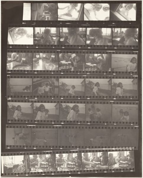 Robert Frank made this contact sheet using traditional photographic materials and processes. It shows a series of images, captured on film, likely developed in a darkroom, and printed onto this sheet. The visible grain and tonal range, from deep blacks to soft grays, speak to the inherent qualities of black and white film. Frank, known for his raw and unfiltered style, embraces the materiality of photography. The images appear casual, but the contact sheet reveals a deliberate act of editing. Photography has a complicated relationship to labor and class. On one hand, a camera can capture images of exploitation, but on the other, the labor involved in photography itself is often invisible. This is the case here: the final image is the product of decisions and skill. Looking at this contact sheet, we can appreciate the skill, the choices, and the labor that went into its making, and to consider the cultural and social narratives embedded in its form.