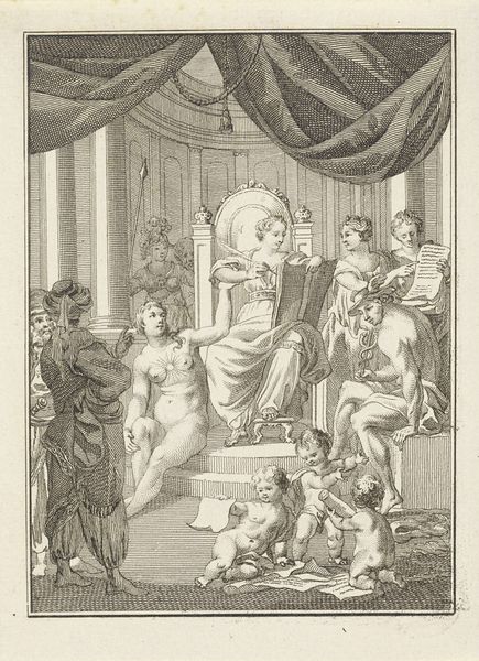 Editor: This is Bernard Picart’s "Allegorische titelpagina met Clio," created in 1731. It's an engraving on paper, and there's so much going on! My first impression is…theatrical, definitely Baroque, and kind of chaotic. What do you see in this piece? Curator: Ah, yes, a perfect encapsulation of Baroque sensibilities! This print pulsates with symbolic weight. Clio, the muse of history, instructs a young nobleman, pointing towards the theater of the world. Look closely. What do you notice about who lifts the curtain? Editor: It looks like…Father Time? Unveiling a stage filled with figures struck by fortune, love, and even death. So, it's a reminder that even historical figures were subject to human fate and emotions, and historical forces. Curator: Precisely. The globe represents earthly knowledge, the books, sources of learning, but the angel lifting the curtain tells us of mortality and immutable fate that overtakes everyone and everything despite those aspirations. Is this optimism or pessimism about the future, and the possibilities for the student? Editor: I hadn't thought of it that way before. Perhaps a balance – the potential for knowledge tempered by the inevitability of human experience. Clio looks determined, almost like, knowledge of history might help! Curator: Yes, history offering a guide in life’s chaotic drama. It suggests that history, when properly studied, can lead to a deeper understanding, even if not complete control, over destiny. A valuable insight for us too, centuries later. Editor: So the symbols help us unpack Picart's ideas about human life? Curator: Symbols preserve our experiences over time! This journey, like life, invites multiple readings, doesn't it?