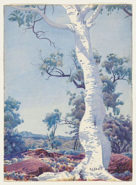 Editor: Here we have Albert Namatjira’s "Central Australian Landscape," painted in 1945. The use of watercolor gives the scene such a soft, dreamlike quality, almost like a memory. How do you interpret the significance of a landscape painting like this during that period? Curator: It's fascinating to consider this painting in its historical context. Namatjira emerged as a commercially successful artist during a time when Aboriginal people were largely excluded from mainstream Australian society. His Western-style watercolor landscapes gained popularity, and that very popularity is what raises crucial questions about the reception and consumption of Indigenous art. Editor: That's a great point. Was it considered revolutionary at the time for an Aboriginal artist to paint in a Western style? Curator: Some viewed it that way, as a bridge between cultures. Others, and this is where it becomes complex, critiqued it as conforming to a Western gaze, essentially painting landscapes that catered to what white Australians wanted to see. It raises the important issue of what expectations were placed on Aboriginal artists during this period. Was his artistic expression truly free? Editor: So the very act of painting landscapes in this way becomes a political statement in itself? Curator: Exactly. Think about who had access to land, who was depicting it, and for whom. The painting itself, a beautiful rendering of the Australian outback, operates as a complex negotiation of identity, representation, and the politics of looking. Do you notice how he used colors that would not be commonly associated to Australian outback? Editor: I do. It makes the landscape seem more inviting and approachable. Curator: Perhaps to cater to the expectations, which speaks to a powerful tension between artistic expression and cultural expectation. Editor: I never thought about landscape paintings holding so much political weight! Thanks for that perspective. Curator: It's a reminder that art doesn't exist in a vacuum. It reflects and shapes the society around it, which is true for both the artist and the audience.