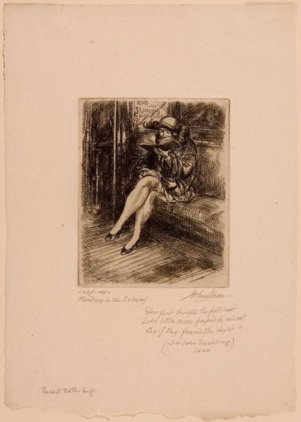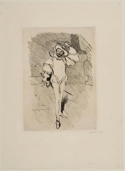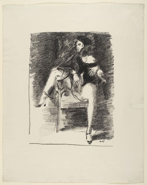 Editor: This is Charlotte Berend-Corinth's drawing of The Dancer Anita Berber. The stark contrast of dark shading against the white paper creates an intense, almost unsettling mood. What symbolic layers do you see in this representation? Curator: The darkness enveloping Berber speaks volumes. It evokes the shadows of Weimar-era Berlin, a time of both liberation and societal decay. The figure is confined by the darkness, suggesting a tragic fate despite the dancer's profession. What emotions does the image evoke in you? Editor: I feel a sense of entrapment, a loss of innocence despite the profession of the subject. Curator: Indeed, that's the power of symbols intersecting with reality. The ephemeral nature of dance, captured in such stark tones, reminds us of the fleeting nature of beauty and life itself. Editor: The work shows how symbols can become potent reminders of specific eras and emotions. Curator: Precisely, a powerful reminder of history etched in ink.