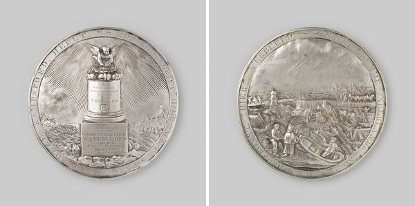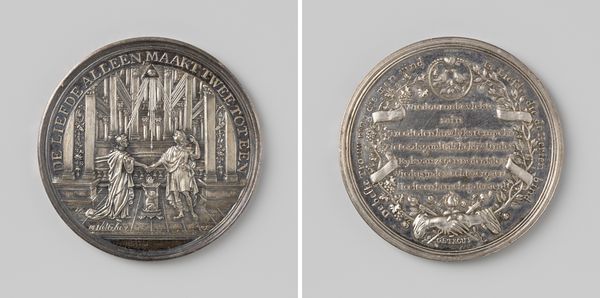 Curator: We're looking at an intriguing metal relief print titled "Opname der Salzburger emigranten in Pruisen," made around 1732 by an anonymous artist. It documents the reception of Salzburg Protestant exiles in Prussia. Editor: Right away, it's giving me coin vibes. Small, weighty, historical, and... circular! There's a story trapped in this little medallion, isn’t there? The figures seem stiff, almost like actors frozen mid-scene on a tiny stage. Curator: The Baroque style is quite evident in the dynamic composition and intricate details compressed within a small format. If we deconstruct its formal elements, note the balanced juxtaposition of the figures with the architectural setting and maritime scene on the obverse, reflecting distinct episodes of arrival and settlement. Editor: Maritime! Exactly! One side feels like hopeful embarking, fresh starts, the other like… rebuilding. There’s definitely labor implied in that second scene. The buildings under construction—you feel the grit and effort, you know? Is that an all-seeing eye at the top? Curator: Indeed. Semiotically, the inclusion of the All-Seeing Eye invites consideration of divine providence and guidance afforded to the migrants in their resettlement journey. Editor: Divine providence and hammers, eh? This almost makes history feel touchable, relatable. All these lives uprooted. It also seems kind of…propagandistic, no? Is it really meant to just record history, or… to celebrate something? Curator: The image does present a distinct narrative aligned with Prussian nation-building. One might read it as commissioned art meant to inspire or unify. Editor: Makes sense. Knowing that adds layers. I see less plain documentary, more of a strategic monument—portable propaganda as it were. Still… even knowing its slant, I keep coming back to those people, both those leaving on boats and the builders hammering at foundations. Real human grit. Curator: Absolutely. Analyzing it now, through our contemporary lens, acknowledges the interplay of art, history, and cultural forces, reinforcing that no artifact is without inherent meaning and intended impact. Editor: Very true. It's not just looking *at* history, it’s hearing its faint echoes still ringing. What seemed like a tiny, pretty trinket turned out to hold entire worlds and motivations.
