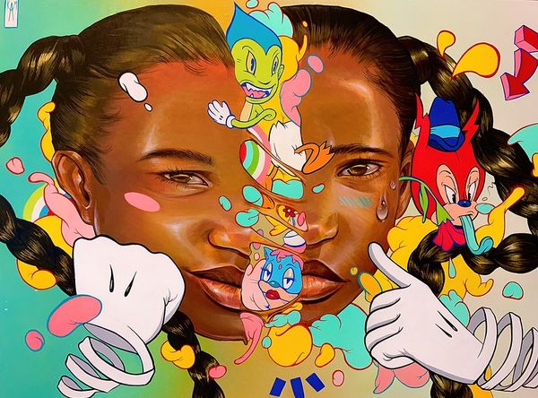 Editor: Kayla Mahaffey's acrylic painting, "Playground Games" from 2021, is certainly vibrant! The juxtaposition of realism and surreal elements gives it a dreamy yet slightly unsettling feel. What are your initial thoughts on its overall impact? Curator: It's interesting how Mahaffey uses familiar visual languages – pop art aesthetics, figuration, even a touch of realism – to create something that feels both accessible and deeply unsettling. Consider how these elements of pop culture serve to normalize the children. Does the vibrant color palette and these playful motifs contribute to this? Editor: Absolutely, the colors create a playful backdrop, but that tension is definitely there. It makes me wonder, what kind of power dynamics might be at play in this constructed playground scene? Curator: Exactly. Look at the figure whose head is obscured by that explosion of color. The vibrant "explosion" acts almost like a form of censorship. Do you see how this disrupts a straightforward reading of childhood innocence, hinting at something more complex, perhaps even the societal pressures or expectations these children might already be facing? The figure wearing Mickey Mouse ears is the only one making direct eye contact with us. This places the other child out of view to us in the painting, highlighting ideas around social pressures. Editor: That's a powerful point! I hadn't considered the head explosion as censorship, but it fits so well. And yes, that steady gaze is striking in contrast. It feels like she is in solidarity with the other. Curator: And in solidarity with viewers of color. Thinking about the cultural context, Mahaffey's work really invites us to examine how the "playground" of society can shape and sometimes distort childhood experiences, particularly for children of color. Editor: I see that tension now, between the joyful elements and this underlying unease, more clearly. It’s really eye-opening how Mahaffey uses recognizable imagery to bring these critical themes to light. Curator: Agreed. It highlights the powerful role art plays in reflecting and shaping our understanding of social dynamics. This gives agency to those children.