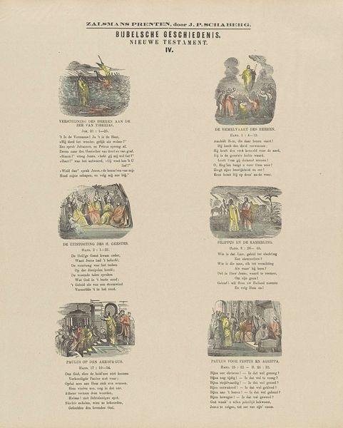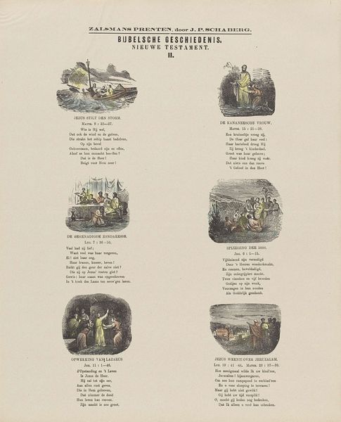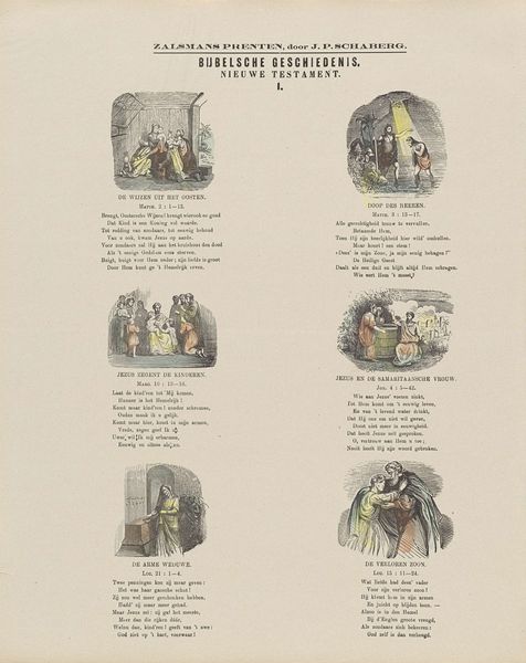 This is an undated print titled "Biblical History / Old Testament" by Gerhardus Philippus Zalsman, likely made with lithography, measuring approximately 42 by 34 centimeters. The print presents six scenes from the Old Testament, each encapsulated within a vignette. The compositions are organized in a grid, which adds a structural framework to the narrative. Note how Zalsman employs a limited palette, with subdued earth tones punctuated by occasional brighter hues to focus on thematic elements. Each scene is accompanied by text, integrating visual and linguistic elements. The use of these separate textual components encourages a semiotic analysis of the image, allowing for a deeper engagement with the underlying narratives. Consider how the layout and visual language invite viewers to engage with these foundational stories, interpreting them through a lens that combines both aesthetic appreciation and cultural understanding.