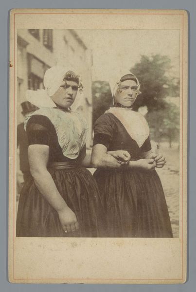 Editor: So, this gelatin silver print, dating sometime between 1864 and 1900, is titled "Portret van een onbekende man en vrouw in traditionele kleding uit Bourg de Batz" by Émile Fürst. I'm struck by the traditional clothing. It makes me wonder about the significance of what they chose to wear. What stands out to you? Curator: Well, the costumes are undoubtedly central to understanding this piece. The textures – the woman’s feathery shawl, the man's unusual hat – are these signifiers of place, of belonging, aren't they? What memories do you think these clothes hold? Editor: I guess they speak to a specific cultural identity? It makes me think of folklore, maybe, and keeping traditions alive? Curator: Precisely. Clothes, particularly traditional dress, functions almost as a language. This image acts as a visual record, preserving these details that speak to collective identity, a cultural memory. The photographer, Fürst, understood the value of recording these, almost as documents. Do you notice the solemnity in their postures? What stories might be behind that? Editor: Perhaps it’s about portraying respect for their heritage. Or maybe the gravity is about something we, as viewers today, aren't privy to, like rituals. Curator: Possibly. Every aspect contributes to the symbolic meaning. Look at their hands: clasped, reserved. Even the way they present themselves conveys profound respect for their heritage, connecting past and present. It captures a fragile moment, the preservation of culture in a rapidly changing world. What feelings do you connect with this? Editor: I think I initially saw it as a simple portrait, but now, seeing it as a statement of cultural pride gives it so much more depth. It’s amazing to see the symbolism embedded in what seemed like everyday attire. Curator: Indeed. These enduring symbols outlive and outspeak us, don't they?