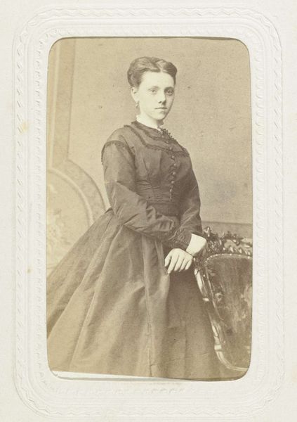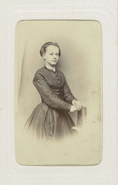 Editor: This is a striking studioportret from between 1863 and 1866 by Wegner & Mottu, housed here at the Rijksmuseum. It's a daguerreotype of a young woman, and I'm really drawn to the way the light falls across her dress. What is your perspective on this work? Curator: Thank you. I observe first the tonal range, constrained as it is by the daguerreotype process, yielding an image reliant on subtle gradations of light. The composition itself adheres to conventions of portraiture, yet the woman's averted gaze introduces an element of introspection. Note how the diagonals of her arms disrupt the verticality, lending the figure a certain dynamic tension, a counterpoint to the formal dress. Editor: So, it’s the visual play between the rigidity of the medium and the almost restless pose of the sitter that interests you? Curator: Precisely. Observe, too, the geometry of the plaid fabric in the dress against the smoothness of the upper bodice. The textural contrast elevates it from simple document to a visual artifact with layers of compositional complexity. We have a study in textures here—a language the image employs beyond mere representation. Editor: That's fascinating! I hadn’t considered the interplay of textures so deliberately. I was so focused on the subject’s expression and attire that I missed those quieter conversations. Curator: Photographic portraits often contain multiple messages operating within their format, playing with the conventions to subtly reflect or refract societal norms and attitudes toward the subject being portrayed. Editor: I learned a lot by carefully studying this artwork and this daguerrotype has far more to say than I first realized. Curator: It has given me reason to observe portraiture conventions with fresh perspective, too.