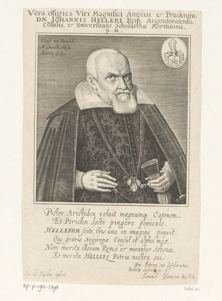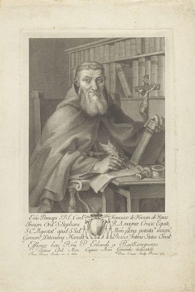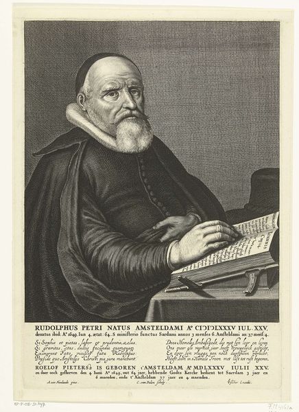 François van Bleyswijck created this engraving, "Portret van Nikolaus Drabik," sometime between the late 17th and early 18th centuries. A somber mood emanates from the portrait, achieved through the stark contrast of light and shadow, a formal quality that directs our eyes to the subject's face. Nikolaus Drabik is captured mid-action, quill in hand, seemingly interrupted from his writing. Note how the composition is divided; the subject is framed against a simple backdrop on the left, while dense text fills the right. This division is not merely aesthetic. Here we can see a clear tension between image and text, representation and interpretation. The use of Latin and the symbolic imagery—like the trumpet—hint at complex religious and intellectual underpinnings. Consider the formal arrangement as a discourse on representation itself. The detailed portrait captures Drabik's physical likeness, while the text aims to encapsulate his essence through language and religious symbolism. This interplay invites us to question how meaning is constructed and communicated.