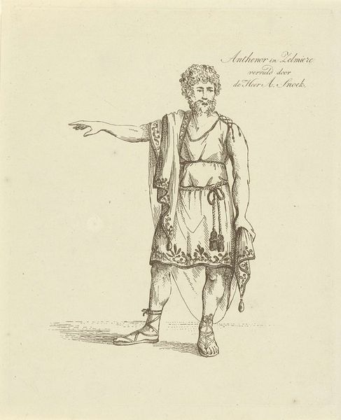 Curator: This drawing at the Rijksmuseum is called "De heer Sardet in de rol van Minnewaart," or "Mr. Sardet in the role of Minnewaart." Johannes Jelgerhuis created it sometime between 1805 and 1836. What strikes you first about this character, seemingly caught mid-gesture? Editor: There’s a quaint theatricality, an almost deliberate awkwardness in the pose. Note the rendering of the limbs, particularly the legs—they don’t quite meet the standards of naturalism. But it contributes to a playful energy. The linework is quite controlled too. Curator: Indeed, Mr. Sardet here impersonates the character "Minnewaart" from the play *Vrouwtje van den Donau,* or *The Little Woman from the Danube.* These caricatures were enormously popular in the Netherlands at this time. Do you read the symbolic weight of this role? Editor: Not overtly. Though the feather in the hat hints at frivolity. The character, judging by appearance alone, seems somewhat pompous and maybe foolish. How was this particular figure viewed within its cultural context? Curator: He represents, I believe, the follies of trying to imitate foreign grandeur. Sardet, portraying Minnewaart, becomes a vessel through which the Dutch could reflect on their cultural identity in relation to perceived foreign affectations. The artist also cleverly uses costume to reinforce a sense of performative identity, of inauthenticity. The frills and puffed sleeves and feathered cap emphasize role-playing. Editor: So it’s the *performance* of Minnewaart, meticulously documented in line. A rendering of an act, in essence. Jelgerhuis uses a fairly restrained palette—or, rather, a lack of one—to bring the focus to the line, shape, and ultimately, the acting itself. This drawing does provide a very unique approach. Curator: Exactly! Through line and form, Jelgerhuis immortalizes not just a person, but a cultural commentary. This role lives on through the sketchwork. Editor: A successful encapsulation through minimal means, and all because of Jelgerhuis. I must say, now looking at it through that lens, it appears deceptively insightful.