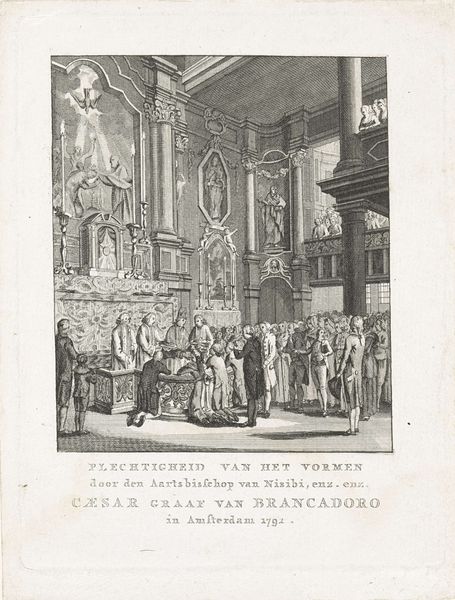Editor: Here we have Noach van der Meer II's "Inauguration of Willem Frederik, Prince of Orange as Sovereign Prince, 1814," an engraving from 1814 housed at the Rijksmuseum. The composition is fascinating—all these men gathered in the church, dwarfed by the architecture. What jumps out to you in this work? Curator: The rigid structure of the engraving immediately calls to mind the historical constraints and political negotiations at play during this period. It captures a moment of profound transition, a shift in power dynamics after the Napoleonic era. It is a visual document of a society grappling with the reshaping of its national identity, wouldn’t you say? Editor: Absolutely. The sheer number of men present also suggests an emphasis on the power of the group. I guess I'm curious about the undercurrents that may not be apparent at first glance? Curator: Indeed. Consider this: who is present and, crucially, who is absent? This is not just a neutral recording of an event; it is a carefully constructed image reinforcing specific notions of sovereignty and legitimacy. Think about the legacy of colonialism, patriarchy and economic disparity which underpin such a display of power. Can we see traces of that here, in the visual choices the engraver made? Editor: That’s a great point. The focus on Willem Frederik, and almost exclusively men, definitely pushes other narratives to the periphery. I didn’t think about it that way initially, but that absence is glaring now. Curator: Exactly. It urges us to question whose voices are amplified in historical narratives and whose are systematically silenced. What we see – and what we don't see – speaks volumes about the social and political hierarchies of the time, doesn’t it? Editor: Absolutely. It provides much food for thought. Curator: To approach art with these critical questions helps us to engage more deeply with its meaning, and consider art's relationship to our own contemporary moment.