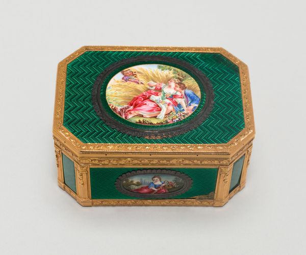 Curator: This gilded snuffbox, dated circa 1820-1840, offers an intriguing glimpse into the decorative arts of its time. It's crafted from gold and entirely enameled with detailed chinoiseries. What are your first impressions? Editor: It’s vibrant! The colours pop, and the miniature scenes convey such a playful energy. The figures are almost caricatures. It feels whimsical, almost as though a dream from the Age of Enlightenment has been rendered in miniature. Curator: That whimsy connects to a broader trend. During that period, there was this fascination in Europe with the "Orient"–filtered, of course, through a very European lens. This aesthetic appropriation, now referred to as Orientalism, served distinct social and political functions, reinforcing imperial narratives. Editor: Absolutely. These Chinoiseries weren't just decorative, they became loaded cultural commodities. We have to consider the colonial context. How did the actual trade relations and power dynamics shape what Europeans thought of as ‘Eastern’? What kind of consumer was envisioned for such a luxury item? Was it meant to evoke ideas of faraway lands, the spice route? Curator: Precisely. The Rococo style, also evident here in the ornate detailing and playful compositions, suggests a clientele seeking refined elegance. And the choice of subject matter—Chinese scenes imagined, or perhaps misinterpreted, through a European eye—speaks volumes about the intended market. A miniature painted box, made from metal and enamel. Editor: Looking closely, I notice the diversity within these imagined scenes. The scenes represent groups working, almost laboring together. Who are the intended subjects, who are the laborers who get elided from view? Are there traces of enslaved peoples whose work allowed elites to buy and use such luxurious objects? It is hard to separate aesthetics from global power relations, when approaching something like this. Curator: It highlights the complicated legacy embedded within seemingly innocent decorative objects. The creation of this seemingly whimsical item required skilled craftspeople, access to materials, and a social structure that supported luxury production. Snuffboxes like these functioned not merely as practical objects but as social currency, underscoring status and wealth. Editor: It is difficult to reconcile the enchanting delicacy of this object with the colonial narrative underpinning it, it’s quite dissonant. Curator: It is! That very dissonance is why examining pieces like this are so powerful. Thank you for offering such illuminating perspectives, this dialogue allows us to think about aesthetics within this cultural setting. Editor: Thanks, it has been an interesting exercise that emphasizes the relationship between wealth and class.
