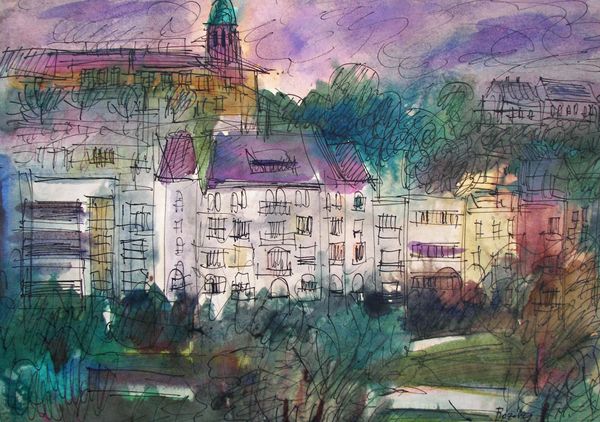 Editor: So, this is Hubertine Heijermans' "House of the Dime in the village Glutieres," painted in 2003. It’s a watercolor, right? It feels very...serene. Like a memory fading into a peaceful dream. What catches your eye in this piece? Curator: It does have that wonderfully wistful quality, doesn't it? For me, it's the way Heijermans captures light. It's not just illumination; it's a mood. See how the soft, diffuse light almost melts the edges of the building and the trees? It's like she's painting the feeling of a sunny afternoon more than the scene itself. Does it remind you of anything? Editor: Monet, perhaps? The impressionistic style… all those short brushstrokes, especially in the foliage. It looks as if the leaves are trembling. Curator: Exactly! You've nailed it. And that's what’s intriguing - this feels like an homage, perhaps, but also something distinctly her own. There’s a certain quiet intimacy. The cows in the meadow almost seem like visitors, like you or I observing from a distance. It isn’t that they are rendered that they give the work life, but in a peculiar and strange way it is us that add them to our mental composition. Now tell me, does the house invite you in or keep you at bay? Editor: I think a little of both? It feels like a place with history, a home, but also a little withdrawn, maybe because of the muted palette? I almost feel like I shouldn't intrude. Curator: Beautifully put! And perhaps that tension—the invitation and the distance—is part of what makes the painting so resonant. Art as echo and silence. Thank you, this insight is quite interesting! Editor: Thanks! I never thought of it that way before, but now I totally see it.