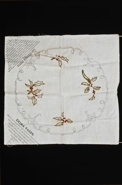 This embroidered cotton towel end, was created by an anonymous maker. As you look at this piece, consider the labor and artistry involved in its creation. Textiles like this were often produced within the domestic sphere, representing a convergence of necessity and creativity. Historically, the creation of textiles, especially embroidery, was closely tied to gender roles, serving as both a means of expression and a marker of skill and status for women. The floral motifs, carefully stitched, may reflect the maker's personal connection to the natural world. These images can be seen as a quiet assertion of identity and agency within the confines of domestic life. The act of repetitive stitching can be understood as a meditative practice, a way to process emotions and experiences through the labor of one's hands. This towel end serves as a reminder of the intimate connections between art, labor, and the everyday lives of individuals whose stories are often overlooked in history.