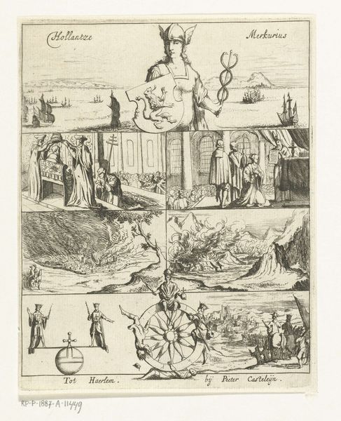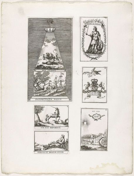 Curator: Let's delve into this 1751 print titled "Decoraties A-E te Den Haag, 1747," housed here at the Rijksmuseum. The piece, crafted with ink and engraving on paper, features a series of allegorical decorations. Editor: My first impression is how intricately crafted these designs are; they're dense with detail, despite being relatively small in scale. The artist clearly had remarkable skill with the burin to produce these tiny emblems. Curator: Indeed. Considering the social context, these decorations likely served a political purpose, perhaps celebrating or legitimizing the House of Orange's rule in the Dutch Republic. The text inscriptions and the symbolic figures point towards such an interpretation. The references to ‘vox populi vox dei,’ and triumph clearly reinforce the existing regime through divinely ordained power. Editor: I agree that the intent feels heavily politicized. And looking closely, one panel features two lions supporting a heraldic shield beneath what seems to be a theatrical drape, giving me this interesting sense of staged power or authority and also perhaps about the theater and drama surrounding authority. How do these various symbols come together for you? Curator: Well, the piece that depicts an ‘all seeing eye’ inside of a triangular prism evokes the Enlightenment ideals, which is intriguing. The image overall gives us insights into the popular consciousness and desires during a tumultuous political era. The engravings provide a snapshot of intersectional power at play and a sense of a society trying to consolidate power. Editor: The meticulous production would have been time-consuming and skillful. The social status and specialized knowledge the artist brings to bear feels worth mentioning; it brings to mind that we can ask of objects ‘who touched it and how.’ In its material creation, what meanings were embedded into these public symbols. Curator: That’s a valid question for analyzing power structures and revealing cultural meanings inherent in these designs. Considering how social movements engage symbols, from the Black Panthers to Queer Nation, can reveal much more than is immediately clear about symbols, art, and public imagination. Editor: So, what's our key takeaway here, seeing as how it all circles back to consumption in this time period? Curator: I think it reveals how the power of symbols and artwork were entangled, then and now, within political and societal frameworks shaping identities and justifying power structures, and their continued circulation and consumption tells us much about a population at that time. Editor: Absolutely, and thinking about the material processes brings the act of celebrating or debating societal change into greater resolution and reminds us of the physical realities embedded within symbolism.