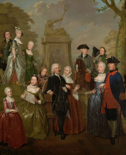 Editor: Here we have Antoine de Favray’s, “David George van Lennep (1712-97), Senior Merchant of the Dutch Factory at Smyrna, and his Wife and Children”, painted between 1769 and 1771 using oil paint. The detail in the fabrics is amazing – how would you interpret the painting's focus on materiality? Curator: Indeed! Let's consider the materiality here not just as visual richness but as a statement about production and consumption. Notice the opulent clothing – silks, furs, ornate hats – what do these textiles suggest about global trade networks and Dutch economic power in Smyrna at the time? Editor: So the fabric isn't just for show, it’s about trade routes? Curator: Exactly. This family portrait becomes an index of the means of production. The materials signal Lennep's status as a merchant deeply involved in global exchange. The act of commissioning the painting itself represents another layer of consumption. Think about the labor required, from raw materials to the artist's hand, and the societal norms represented! How might you see these norms displayed here? Editor: I guess that the family’s formal arrangement and fine garments point to the traditional views on family at the time. The children’s elaborate costumes and toys show privilege too. But looking closer, is it only traditional, though? Like that hat is giving some personality… Curator: Precisely! There may also be subtle expressions of resistance or individual character embedded in this formal structure. It’s not a monolithic view; the materiality invites us to decode complex power dynamics and personal choices operating within a historical moment. What is the piece communicating? Editor: I hadn’t considered how much the materials themselves—paint, canvas, fabric—speak to global economies and societal norms. I’ll never see fabrics and decor the same way. Curator: And, with each artwork, the materiality tells us a new story about that era and its influence, so there is still a lot for both of us to learn!