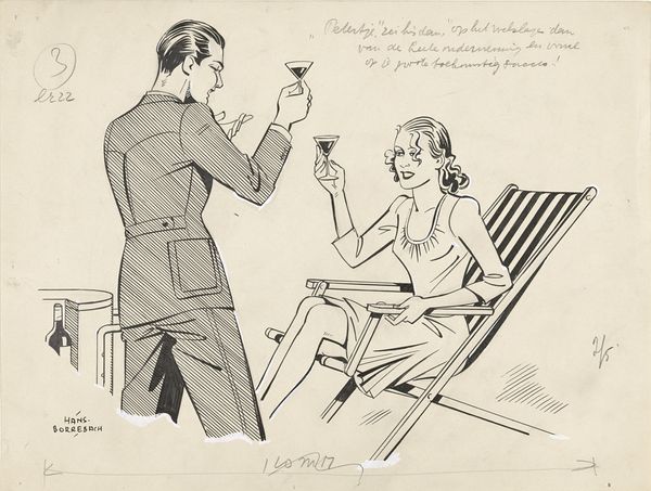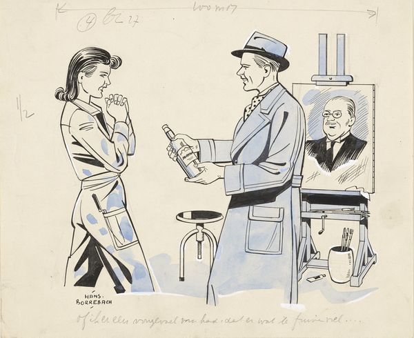 Editor: We’re looking at "Man en vrouw aan een tafel," or "Man and woman at a table," a sketch done by Hans Borrebach sometime before 1945. It looks like ink and maybe watercolor on paper. It's... well, it's a bit stiff, almost like a magazine illustration from the '30s. The table is so big it creates an imbalance. What do you see in it? Curator: Stiff, yes, but deliberately so, I think. There's a kind of theatricality. He with his pipe, she with her rather severe hat. The vast, empty table is their stage, a space of potential negotiation or, perhaps, simmering conflict. That lamp – it feels very Magritte-esque, doesn't it? Almost daring us to think it shouldn't be there. Is it illuminating their hopes or spotlighting their disappointments? Borrebach captures the space *between* the characters masterfully, in the air and the setting, too. What are they saying without speaking, I wonder? Editor: The emptiness of the table, that *is* interesting. They seem almost separated by it. Do you think the cartoonish style detracts from any deeper meaning? Curator: Detracts? Not at all! Caricature can be a shortcut to truth, wouldn't you agree? It’s not about realism; it’s about distillation. Think about it: those strong lines, those economical uses of color – they're telling us precisely what we need to know and, equally important, what we *don't* need to know. Borrebach gives us just enough detail to fire our imaginations, and in so doing he shows us what matters. Editor: I never thought about caricature that way, as a form of revealing the truth rather than distorting it. I guess I was so caught up in the seemingly old-fashioned style I overlooked that. Thanks! Curator: Absolutely! And perhaps by leaving so much unsaid, it reminds us of the unseen pressures and unspoken desires bubbling beneath the surface of any social interaction. I have certainly enjoyed looking at this, and discussing the possibilities within!
