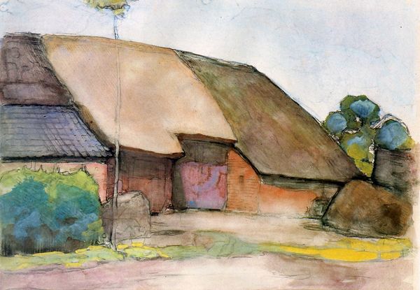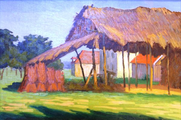 Editor: So, here we have Cézanne's "The Oilmill" from 1871, an oil painting. It feels...rustic. The buildings almost huddle together, and the colors are so earthy. What do you see in this piece? Curator: I see a yearning for an older way of life. Oilmills, especially at this time, are symbols of tradition, of self-sufficiency. Consider the darkness of the trees surrounding the mill – it evokes the density of time and history bearing down on this place. But notice how Cézanne doesn’t romanticize it completely. Editor: What do you mean? Curator: The brushstrokes are broken, fragmented. The scene isn’t seamless, like a photograph might render it. Is that sense of unease perhaps connected to anxieties brought about by modernization and its effect on rural populations? Editor: Maybe it's not just a simple landscape; the oil mill is loaded with meanings beyond what meets the eye. It makes you think about a disappearing way of life. Curator: Precisely. It is loaded. We could even explore its connection to concepts of "harvest," cycles of life, the bounty of the land as they persist through centuries. Can you think of any connections like these to prior or current works? Editor: Well, now that you mention the cyclical thing, it has resonance across time. That helps me think about not only its art historical place, but also its place in culture. Thanks for opening my eyes! Curator: Indeed! Seeing how an image is loaded with symbolism is very rewarding. There is more than initially meets the eye.