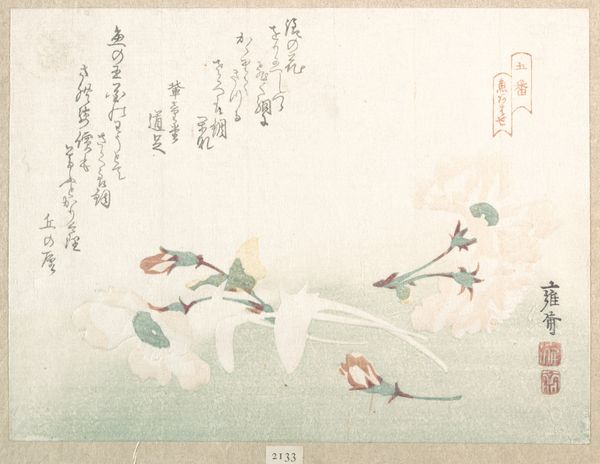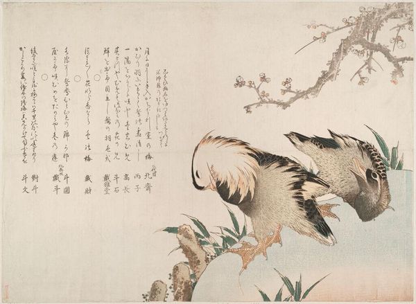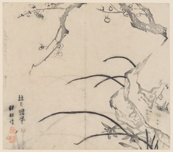 This print, "Halibuts and a Bow with Arrow Hanging on a Plum Tree", was made by Ryūryūkyo Shinsai, sometime in the early 19th century. It is a woodblock print, meaning that the image was first carved into a block of wood, then inked and pressed onto paper. Look closely, and you can see the layering of colors, each requiring a separate block. This labor-intensive process was part of a thriving industry in Japan at the time, producing images for mass consumption. The materials used were relatively inexpensive: wood, paper, and pigments. But the skill required to carve the blocks and print the images was considerable, representing years of training and practice. The flat, graphic quality of the print is a direct result of the woodblock process, with its emphasis on clear lines and bold colors. Consider the social context: prints like this were not considered high art, but rather a popular form of entertainment, affordable to a wide range of people. Appreciating the materials and processes involved helps us understand the cultural significance of this seemingly simple image.
