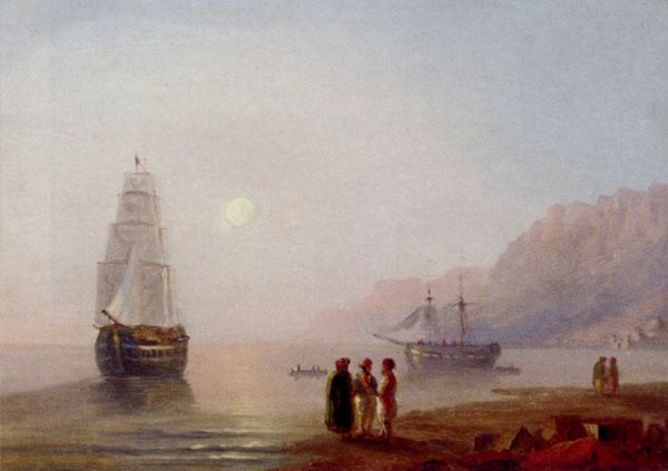 Curator: Looking at Hans Gude's "Norwegian Harbor of Refuge, or Port of Refuge on the Norwegian Coast," painted in 1873 using oil paints, my immediate reaction is one of stark beauty tinged with melancholy. There's something about the grey skies pressing down on the scene that really resonates. What about you? Editor: Well, I’m immediately drawn to the palpable sense of labor embedded within the landscape. The activity on the docks is as prominent as the idle ships themselves, no? Curator: Absolutely. The human element here feels vital. Look at how Gude uses light to emphasize the workers, connecting their toil to the rough beauty of the natural harbour itself. The scene seems reliant on these anonymous labors for its meaning, I guess. Editor: Indeed. This is not some untouched, sublime wilderness as we might expect of the Romantic style. Gude’s brush highlights the dependency upon those structures that support the social fabric: docks, tools, the ships in various states of disrepair. Think of the production of maritime culture; this harbour becomes a stage of making and unmaking. Curator: You're right, the "making and unmaking" is so present. The worn hulls of the ships really tell a story. And there is also the materiality: look closely at the way the oil paint recreates both the roiling water and the solid, almost monumental forms of the coastal rocks. Editor: Note also the blending of romanticism with a strain of realism: it is no coincidence that so many artists in this period were attentive to both epic scenes and material cultures of the day. One is lost without the other. Curator: I find that balance especially poignant when thinking about the context, painted as it was, with Norway finding its own identity as an independent nation. This port feels like both a safe haven, and a point of departure into the wider world. Editor: Yes, that dynamic tension certainly rings true given the historical moment. It really underscores the painting’s resonance for a society in the throes of massive change and national identity formation. We see these themes expressed in the choice of realism blended with grand narratives. Curator: Reflecting, it seems impossible to divorce the immediate appeal from the labor and material considerations inherent in both the scene represented and the paint which enables the image. Thanks for the conversation! Editor: Absolutely. This piece offers a particularly rich nexus for connecting our emotional and more critical inquiries. Thanks!