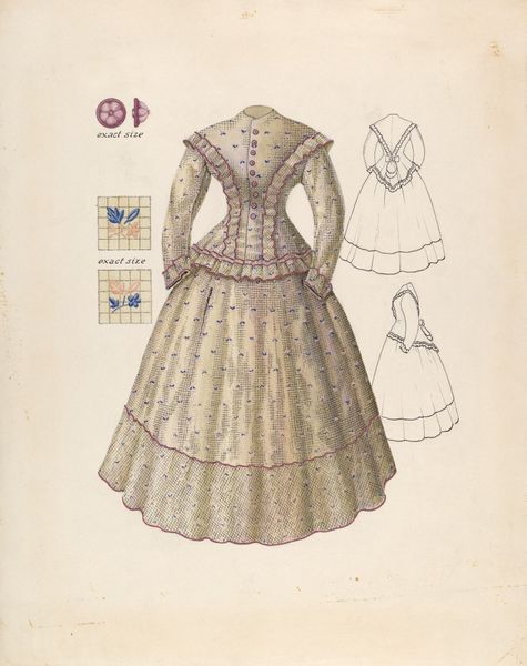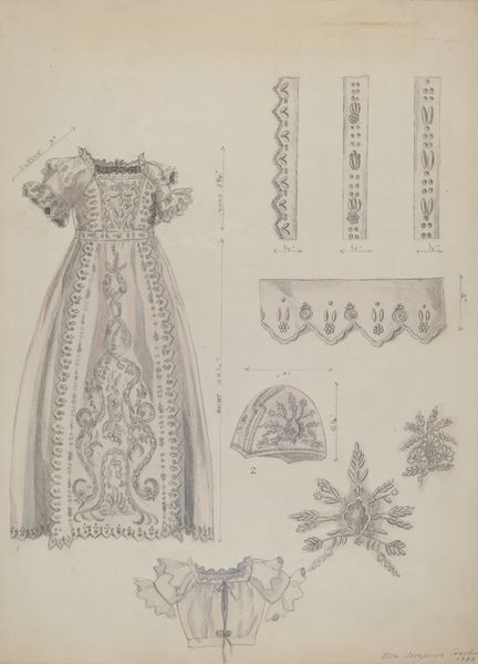 Editor: We’re looking at “Embroidered Dress & Mull Cap,” a pencil and paper drawing from 1936 by Ella Josephine Sterling. It's like a page torn from a seamstress's notebook. It feels both technical and intimate. I'm curious, what stands out to you when you look at it? Curator: Ah, this piece whispers of forgotten skills and quiet hours spent meticulously planning. See how the artist hasn't just drawn the dress but deconstructed it, presenting detailed studies of its embroidered components? It’s almost an act of devotion to the craft itself. Makes me wonder what hands would have brought it to life, don’t you think? Did this vision ever become something real? Editor: It does have that speculative quality! So much care in the details. I also noticed the handwriting with measurements; it makes the artistic intention more concrete. Curator: Yes! It bridges the gap between artistry and functionality. The annotations anchor the sketch to a physical reality, but don’t diminish the aesthetic allure. Do you notice how she plays with positive and negative space, suggesting the fabric's texture through the absence of line? It’s like a secret language known only to textile aficionados! And do you feel a hint of melancholy emanating from the paper? A longing to be embodied by somebody perhaps? Editor: I do. Like looking at a pressed flower, lovely but removed from its context. It makes me wonder about the cultural context of clothing at that time, what it might have symbolized? Curator: Indeed, each stitch probably tells a tale – about its maker, about societal expectation of women, of elegance on the edge of war. Think of what clothes do in our daily lives and what that would mean decades ago. Thank you, that adds a fresh dimension. Editor: Well, thank you! I definitely see more here now, and I appreciate how the artistic value goes beyond just visual appeal. Curator: Likewise! The act of studying craft as art… what could be more worthwhile?