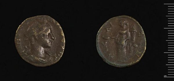 Curator: Here we have a sestertius, a Roman coin, featuring Commodus. Editor: It looks like a whisper from the past, doesn't it? That weathered bronze holds so much history, yet feels surprisingly intimate. Curator: It's fascinating how this small object, likely made during Commodus's reign, can act as both propaganda and personal statement. Notice the figure on the reverse. Editor: Yes, standing tall, almost like a god, or at least aspiring to be. The coin suggests a desire for power, immortality... or maybe just good PR. Curator: Coins were carefully designed with symbolic imagery, meant to communicate messages about the emperor's strength and virtues. This one offers a glimpse into the world of Commodus. Editor: Makes you wonder what the people who handled this thought of him, eh? Holding power, literally, in the palm of your hand. There is something powerful about that.