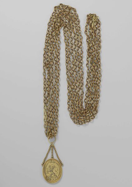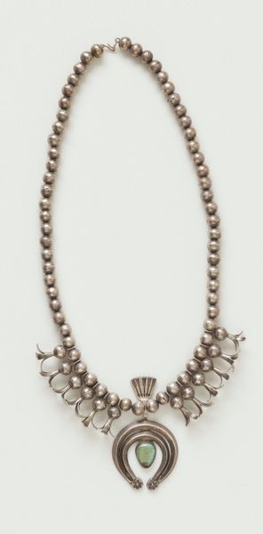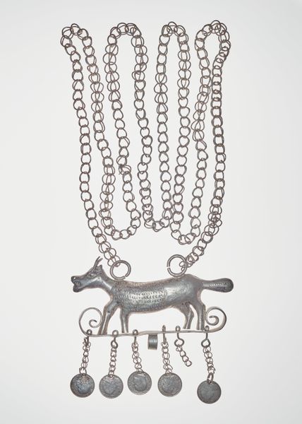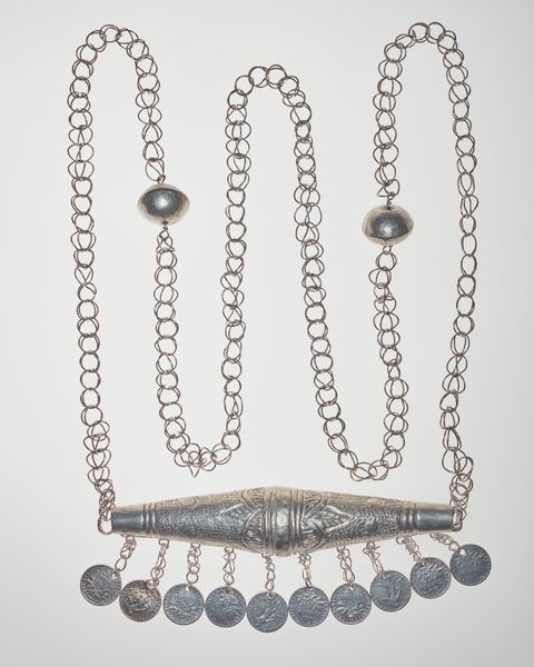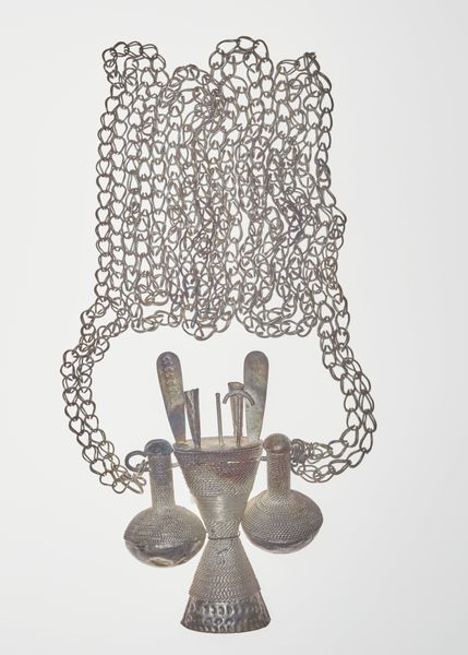This silver necklace with cylinder ornament and coin pendants was created by the Fon people. Notice how the repetitive, interlocking links of the chain create a strong vertical rhythm that contrasts with the solid, horizontal cylinder. The cylinder itself is segmented, marked by deep grooves that visually break the form into distinct units. This division introduces a modular quality, almost as if each segment could be independently significant. Hanging below, the coin pendants add a dangling, kinetic element. The choice of silver as a medium is not merely decorative. The reflective surface of the metal creates a play of light and shadow. It invites us to consider how value is culturally constructed. The necklace’s structure and materiality embodies the Fon people’s complex social values.