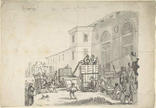 Curator: Rombertus Julianus van Arum created this engraving, "Lezende jongen voor een boekenkraam," sometime between 1827 and 1883. Editor: My initial reaction? The boy's completely lost in that book, oblivious to the bustle around him! The line work is surprisingly delicate for a bustling cityscape, almost as if it belongs in a private sketchbook. Curator: It is fascinating how Van Arum captures the commercialization of literature within the burgeoning urban environment. The presence of the bookstall signals an important shift in the availability of printed material. Books began to reach a wider audience, shaping public opinion and literacy in unique ways. Editor: Definitely feels like the moment knowledge shifted from the hands of the elite, trickling down like that rooftop rainwater! I love how the city's hard angles fade softly into the leafy overgrowth. Does that symbolize how the exchange of wisdom is slowly shaping society’s rigid walls, perhaps? Curator: The contrast between the solid architecture of the city walls and the temporary nature of the bookstall underscores the idea that while institutions might be enduring, cultural trends, even those promoted through printed matter, are fluid. The artist’s clever depiction also reminds us that access to literature was a critical ingredient to participate in socio-political life. Editor: So true. And even the perspective of the characters depicted creates a conversation. See how the bookseller practically looms, observing the bookish youth, one wonders if their interactions carry political dimensions. The composition seems to say, knowledge isn't always free, eh? There's always a transaction, an exchange of power dynamics lurking in the shadows of a market economy. Curator: I agree that it's an incisive work, considering the evolving role of published information during the nineteenth century. One is encouraged to see it in the larger context of cultural revolutions shaping the arts. Editor: Exactly, the drawing holds so much layered, societal meaning behind what it appears to portray at first glance. Curator: Indeed, a truly captivating scene, made even more so with our exploration of the image. Editor: Precisely, and hopefully inspiring us to seek meaning beyond the book's pages!