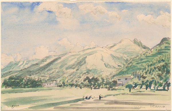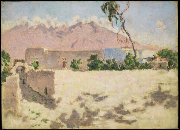 Curator: Here we have Denman Waldo Ross's watercolor, "Puebla, Mexico." It captures a scene, bathed in the soft light of what feels like late afternoon. Editor: My first impression is that the piece really emphasizes the arid landscape—the muted colors and that figure walking into the sun are evocative. Curator: Ross seemed taken by the way light interacts with the buildings and open spaces. Look at the washes of color— almost capturing a mirage. Editor: Exactly. And thinking about it, the use of watercolor allows for that translucent quality, mirroring the ephemeral nature of light itself, but also making visible the traces of the artist's hand. Curator: It’s a lovely, quiet moment captured with such sensitivity. Editor: It speaks to the beauty found in the everyday, through the materials of its making.
