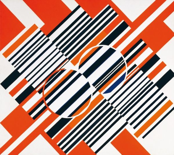 Curator: Gunter Fruhtrunk's "Untitled" from 1967, rendered in acrylic paint, offers a striking example of Op Art from the period. Editor: It definitely hits you right away with that bold contrast! The sharp yellow lines slicing through the dark ground… it feels almost confrontational. Like a warning sign. Curator: That starkness is quite intentional. Fruhtrunk, associated with German Expressionism, was deeply interested in the visual language of postwar reconstruction and societal shifts. Editor: So the geometry isn't just decorative? How do the composition's visual components shape this reading? Curator: Exactly. The arrangement avoids any central focus; these lines crisscross without resolution, speaking to the destabilization of established orders in the wake of conflict. Its hard-edge painting reduces depth of space while bringing it out. It reflects society. Editor: I can see that. There’s something very... calculated about how these dynamic stripes lock the viewers' attention, but ultimately go nowhere, almost dizzying in effect. Curator: And while visually striking, "Untitled" maintains a strong dialogue with the Bauhaus movement’s emphasis on rationality and function in art. These stripes might reference the reconstruction boom while also questioning it through abstraction. Editor: Do you think Fruhtrunk succeeds? Curator: It’s complex. The immediate visual punch creates an emotional response, almost against your will, which might also criticize the rapid, unconsidered developments of the era. He provides depth with his manipulation of colours. Editor: Interesting how a seemingly simple pattern can hold so many layers of meaning. I’ll never look at a straight line the same way again. Curator: Hopefully this has provided fresh perspectives. Fruhtrunk's paintings show us art is as reflective of social movements as any news broadcast.
