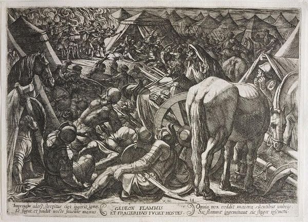 Curator: This print, "Gideon Invading the Camp of his Enemies" by Antonio Tempesta, presents a chaotic scene. What strikes you first? Editor: The sheer number of figures! And the detail, despite it being just a print. It feels very...busy. How do you interpret it? Curator: Consider the labor involved. The metal plate, the tools, the artist's hand meticulously etching this battle. Think about the paper, where it came from, and its cost. Then, the social context: prints like these circulated widely, disseminating narratives of power and conflict. What does its accessibility say about its purpose? Editor: So, it's not just about the battle itself, but about the materials and the process of making it available to a wider audience. Interesting! Curator: Exactly. It makes you think about the relationship between art, labor, and the spread of ideas, doesn't it? Editor: Absolutely. I hadn't considered the implications of the printmaking process itself.