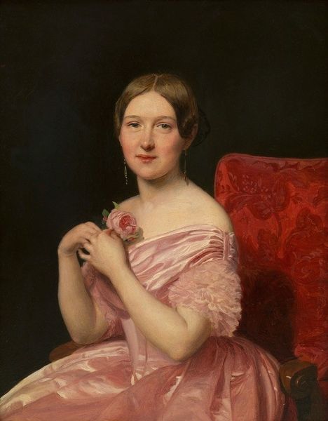 Ferdinand Georg Waldmüller made this portrait of a seated girl in a white satin dress, using oil paints. The material qualities of satin are crucial here: its sheen, drape, and crispness all speak to wealth and status. Waldmüller has skillfully captured these, using delicate brushwork to render the fabric's subtle gradations of light. But we might also consider the dress itself as an object of craft. The textile would have been woven on a complex loom, then cut and sewn by skilled hands, and its pale color achieved through careful bleaching and dying processes. The girl's pose is relaxed, but the dress is anything but casual. It's a garment intended to impress, to convey the wearer's social position, and to assert a sense of decorum. The dress required the labor of many, yet all this is distilled into the image of a single, privileged girl. It invites us to consider the social dynamics embedded in even the most seemingly straightforward of portraits.