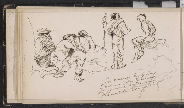 Editor: This is Johannes Tavenraat's "Hunting Party with Dogs," dating from the 1870s. It's a pen and ink drawing on paper, a quick sketch really. What strikes me is how relaxed everyone seems – both the hunters and their dogs. What do you see in this piece? Curator: I see a tableau steeped in the visual language of leisure and camaraderie. The dogs, various breeds rendered with simple lines, evoke a sense of loyalty and partnership central to the hunt. Notice how Tavenraat contrasts the active pose of some dogs with the repose of the reclining figure. What does that juxtaposition suggest to you? Editor: Perhaps it shows different roles within the hunting party? Some are still alert, while others are resting after the chase? Curator: Precisely! And beyond that, consider the broader symbolism of the hunt. For centuries, hunting scenes have appeared in art, carrying a weight of cultural significance beyond the literal depiction. They represent power, social status, but also a connection to the natural world and primal instincts. Do you see echoes of those earlier traditions in this sketch? Editor: I hadn't thought of that. The informality of the scene made me focus on the present moment, but you're right, there’s a link to that long history of hunting imagery. Curator: Indeed. And the handwritten notes alongside the sketch – presumably Tavenraat’s own – offer an additional layer, hinting at a personal narrative intertwined with this iconic subject. They're little clues, whispers of meaning. It’s as if Tavenraat invites us into his thought process. What have you discovered about this image from our chat? Editor: I’ve realised it's more than just a casual sketch; it's a rich tapestry of cultural memory woven into a seemingly simple scene. Thank you. Curator: My pleasure. And I have been reminded of the subtle ways an artist can condense layers of cultural memory into even the most unassuming image.