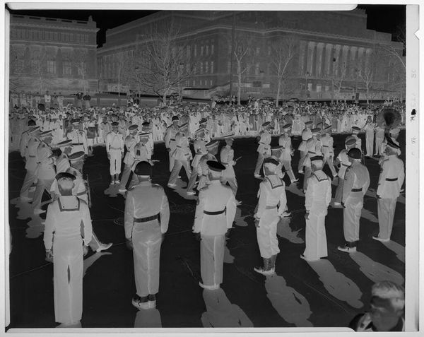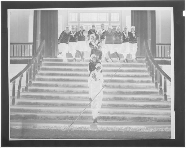Curator: This intriguing, untitled photograph by Hamblin Studio captures a group portrait of uniformed firemen. It’s part of the Harvard Art Museums collection. Editor: The crisp uniformity immediately strikes me – a powerful image, almost ghostly, due to the negative's high contrast. It's a statement about order and civic duty. Curator: Absolutely, the firemen's uniforms function as symbols of public service and collective identity. It really speaks to the cultural memory of firefighters as pillars of the community. Editor: I'm drawn to the material reality – the photographic process itself, the darkroom labor, the standardization of their attire and even their poses. A very stiff formality. Curator: And there's a curious ritualistic aspect too, a frozen moment commemorating their service, almost like an icon of civic responsibility. Editor: It certainly makes you consider the role photography played in shaping public perception of these civil servants. A very intriguing record. Curator: Agreed, a reminder of shared values, and a fascinating visual symbol of community. Editor: Yes, it makes me think about the industrialization of heroism and the social dynamics it depicts.