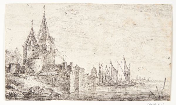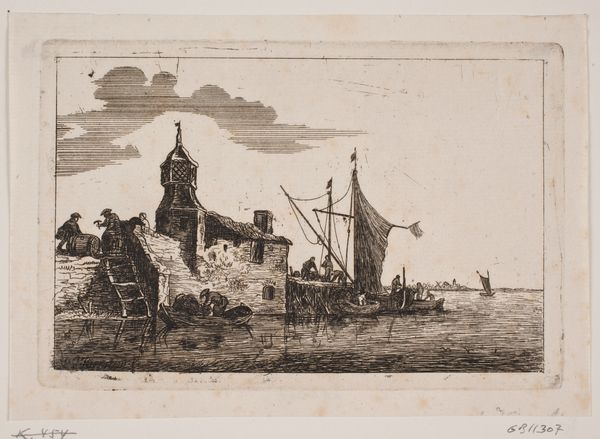Editor: Here we have Anthonie Waterloo's "Hejseværk ved en flod," an etching from between 1610 and 1690. The cityscape feels really delicate and peaceful. What stands out to you in this work? Curator: The lifting mechanism immediately grabs my attention. What purpose does this form serve in relationship to the rest of the picture, I wonder? How does the visual prominence of that equipment contrast with the decay we can perceive on the architectural surfaces in the background? Editor: That’s a great question. Maybe it speaks to a changing society, where technology is advancing, but old structures are left to degrade. Curator: Precisely! Note the intricate details captured through the etching technique. See how light plays on the water's surface, mirroring the architecture? Water, a classic symbol of the subconscious, here literally reflects the heights of civilization. Do you think it shows progress or loss? Editor: That’s an interesting perspective I hadn’t considered. It feels more balanced now – a reflection on time, perhaps, the new juxtaposed against the enduring past, both supported by the bedrock of shared knowledge. Curator: Precisely! This symbol conveys collective unconscious; an icon reflecting shifting perspectives over time, each detail layering new meanings over the image. A visual document reflecting cultural values! What do you see when you look closely? Editor: Seeing it as a reflection makes me think about how symbols change their meaning depending on who's viewing them. Thanks for the deeper look! Curator: And thank you for opening my eyes again. Symbols always retain new possibilities for further consideration.
