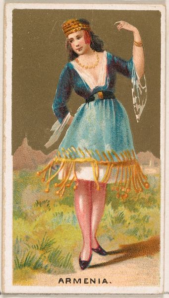 Editor: So, here we have "Fife and Bagpipe," a colourful print from 1888 by W. Duke, Sons & Co., part of their Musical Instruments series. It’s quite striking, almost dreamlike in its presentation of the musicians and their instruments. What do you make of its, dare I say, vintage charm? Curator: Charm is definitely one word for it! To me, these types of prints always whisper stories of a bygone era, a time when such elaborate cards were everyday objects. This card strikes a chord, suggesting at once musical heritage, perhaps even national pride. What do you think the symbolism behind pairing these particular instruments could be? Editor: Well, they're both wind instruments, obviously. Maybe it's just showcasing diversity in music, showing both a more refined flute, versus the, perhaps, rowdier bagpipe? Curator: Interesting! It makes me think of a charming cultural mash-up— a kind of musical diplomacy that, perhaps unknowingly, reflects a very young America finding its identity on the world stage. Plus, the clothes they're wearing and the somewhat absurd props are very evocative. What does it trigger in you? Editor: I agree about the cultural mix. It's fascinating to think about these small pieces of commercial art circulating and shaping perceptions. I wonder what the intended audience thought of it back then, if they felt connected to these exotic portrayals. Curator: A fantastic point! Advertising is rarely just about the product itself. It also involves selling aspirations and sometimes creating an air of aspirational mystery around something as common as, say, tobacco. Don't you think this artwork transcends its promotional purpose, inviting viewers to really reflect on culture? Editor: Absolutely! Thinking about the layers of meaning packed into this small card has completely changed my perspective on these seemingly simple promotional items. It's more than just an ad. Curator: Exactly! Art, even in unexpected places, truly holds a mirror to society and inspires deeper insights.