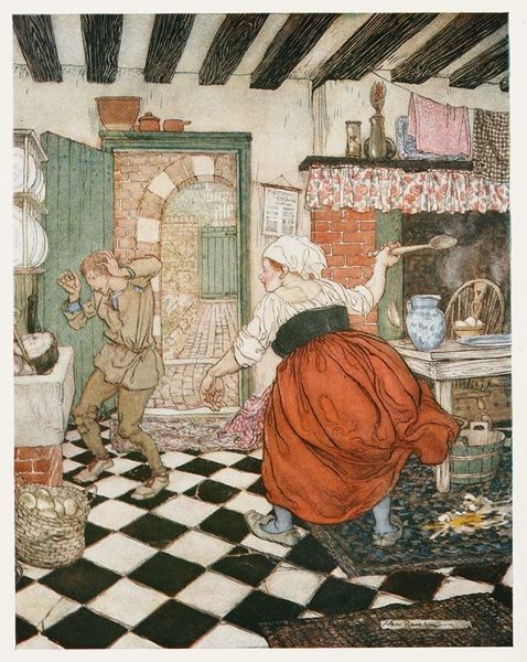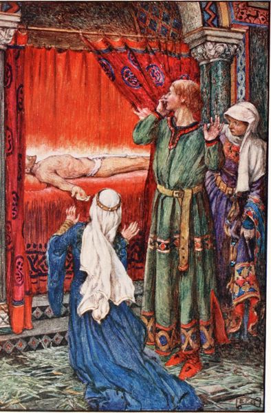 Arthur Rackham created this illustration, "The Boat with the Dead Maid of Astolat Before the Palace at Westminster," with ink and watercolor. The composition divides into distinct horizontal layers: the murky water in the foreground, the boat carrying the deceased maiden, and the gathering of figures on the embankment behind. Rackham’s color palette here is muted, dominated by earthy tones, which evoke a sense of solemnity and finality. Notice the contrast between the stillness of the maiden and the dynamic posture of the boatman, who is caught in a moment of exertion. This juxtaposition between stasis and action creates a visual tension, inviting us to contemplate the threshold between life and death. The architectural backdrop, rendered with detailed precision, adds another layer of complexity, contrasting the cold stone with the vulnerability of the human figures. The image, as a whole, presents a study in contrasts: light and shadow, movement and stillness, the living and the dead, all of which converge to form a deeply symbolic tableau. This intersection of visual elements serves to unsettle fixed meanings, inviting ongoing interpretation.