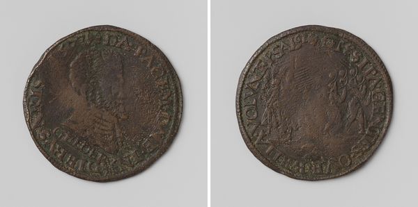 Editor: Here we have a 1585 engraving titled "Inname van Antwerpen", housed at the Rijksmuseum. It's a fascinating metal print. Given its historical context, the small scale surprises me. How should we understand this work? Curator: As a material object produced within a specific economic and political structure, this engraving offers unique insights. Consider the labor involved. The engraver, likely working within a workshop, meticulously transferred an image onto a metal plate. How does this act of reproduction democratize or manipulate the depicted historical narrative of the capture of Antwerp? Editor: That’s a good point, as this could be multiplied... The narrative gets interesting with a potentially larger distribution than, say, an oil painting. Curator: Exactly. Now, think about the materials. Metal—durable, reproducible, and tradeable. Its inherent value reflects the economic engine driving this historical moment. Do you see any specific compositional choices drawing your attention? Editor: I think of the distribution: how readily available or expensive was a piece like this? Who consumed such prints and why? Curator: Good question. The scale is equally important. This isn't grand history painting for an elite patron. Its intimacy suggests a broader, perhaps bourgeois, market keen to consume political imagery. Its status as a traded good adds to this theory of a distributed narrative for economical purpose. What new layers does this knowledge introduce to the initial impact the image created on you? Editor: It changes everything! It shifts from just an image to a political tool, bought and sold. So the work of art becomes not just an aesthetic object but evidence of production and capital in a moment of conflict. Curator: Precisely! This small print illuminates the interconnectedness of art, labor, and historical narrative within the material conditions of its making.
