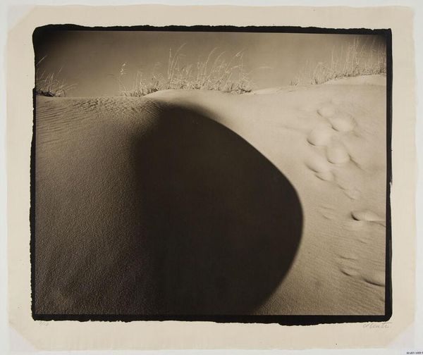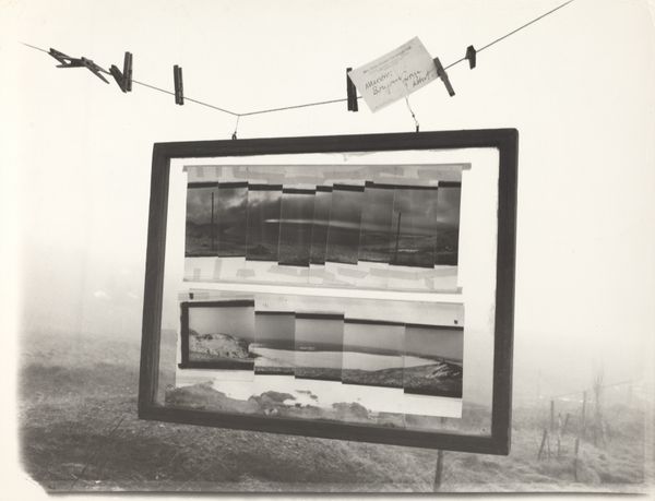 Editor: This is Lee Miller's "Portrait of Space, near Siwa, Egypt", likely taken sometime between 1937 and 1989. It’s a gelatin silver print. I'm struck by the layering—the frame within the frame, and how the fabric interacts with the landscape. It feels very staged, yet the landscape itself is so natural. How do you interpret this work? Curator: It's a fascinating piece of photographic artifice. Note the square aperture suspended in the composition's upper register, juxtaposed against the arid landscape viewed through the window. The suspended frame challenges our perception, disrupting the assumed transparency of the photographic medium. Observe how Miller manipulates the plane of vision by interposing what seems like a torn scrim, fracturing our gaze and creating an intriguing interplay between foreground and background, flatness and depth. The gelatin silver print medium lends itself well to this disorienting image. Editor: So you’re seeing the formal elements as intentionally creating that feeling of disruption? Curator: Precisely. The interplay of geometric forms – the suspended square, the rectangular window frame – against the organic contours of the desert horizon establish a calculated visual rhythm, disrupting the viewer's spatial orientation. The high contrast of the gelatin silver print intensifies this effect, emphasizing the formal relationships over representational accuracy. The success of the piece hinges not upon a representation of Egypt, but rather the arrangement of shapes, tones, and textures within the frame. Editor: I see. So it's less about *what* is depicted and more about *how* it's depicted. The artist calls our attention to the medium through the image itself! Thanks so much for shedding some light on that. Curator: Indeed. By examining the formal properties, the structural integrity, and material agency of this piece, we achieve a clearer understanding of Miller’s innovative vision and the broader implications of Surrealist photography.