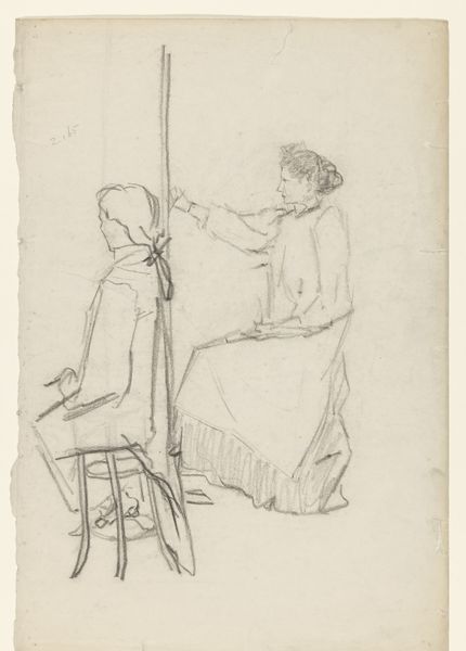 Otto Scholderer created this drawing, "The new Polly," with graphite on paper. The composition is quietly engaging; it draws you into a domestic moment rendered with delicate lines and subtle shading. A young girl stands on a chair, reaching towards a birdcage, while the surrounding space is defined by a soft, ambient light. Scholderer employs a structural approach to space, dividing the composition into distinct planes. The foreground, middle ground, and background interact to create depth while maintaining a sense of flatness, reminiscent of early modernist explorations. The lines are used not just descriptively, but also to construct relationships between objects and figures. Notice how the structural elements of the chair, cage, and figure are interwoven to create a balanced yet dynamic composition. It's a study in contrasts and relationships, inviting us to consider how we construct meaning through the visual language of art.