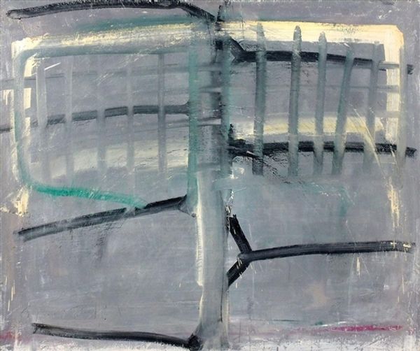 Moshe Kupferman made this "Untitled" painting, and it feels like he's building up and scraping away layers of memory. The colours are muted, almost ghostly, and the grid-like structure is so fascinating because it’s both there and not there. Look at how Kupferman applies the paint – thin washes, scratches, erasures. He's kind of building a structure and then undermining it, questioning it. In the lower part of the painting, these dark, vertical strokes feel almost like a barrier, but one that's permeable, dissolving. It's easy to imagine how a painter like Agnes Martin, with her quiet grids and subtle colour, might be a reference point. Like Martin, Kupferman embraces ambiguity, understanding that art isn't about fixed meanings but about the ongoing, ever-evolving conversation.