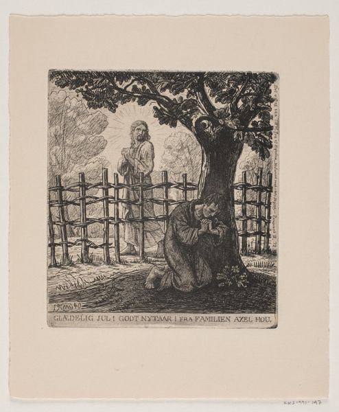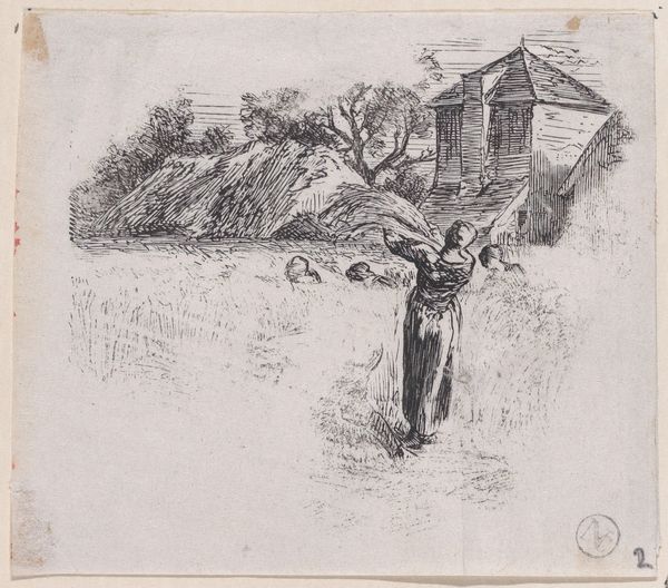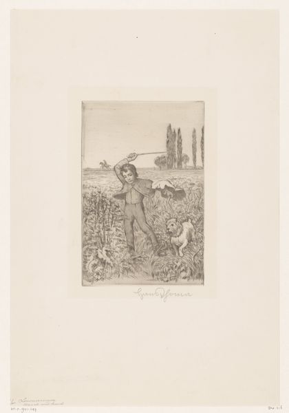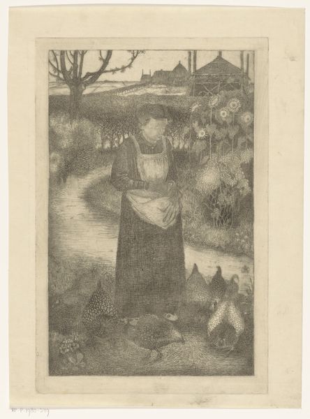 Editor: Here we have Willem Witsen's etching, "Vrouw reikt omhoog naar de takken van een appelboom," created around 1908-1909. It's currently housed at the Rijksmuseum. It strikes me as intensely personal and introspective, almost a memory captured in ink. What's your take? Curator: It does whisper, doesn't it? The way Witsen has rendered light and shadow... I see a reaching – not just for apples, perhaps, but for something more elusive. The lone figure against the landscape... she's almost dwarfed, wouldn't you say? Does it feel like isolation to you? Editor: It does. And the garments hanging there--is it a symbol of a specific story, or maybe something more universal like forgotten experiences? Curator: That's a great point! To me, it feels intensely personal. It almost evokes a dreamscape or perhaps a memory trying to resurface. I love the intimacy and, yes, a certain quiet melancholy about the everyday. Editor: It makes me think about how we leave imprints on landscapes and memories. It feels layered – technique, emotion, place… all in one. Thank you for expanding my perspective. Curator: My pleasure. It’s the layers that keep us coming back, isn't it? Each viewing reveals a little more of the artist – and ourselves.