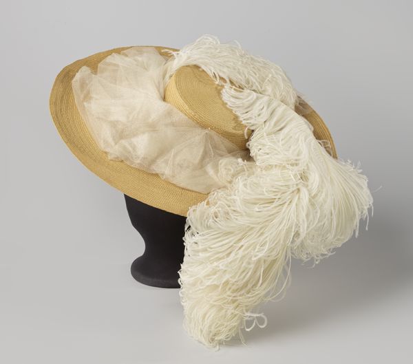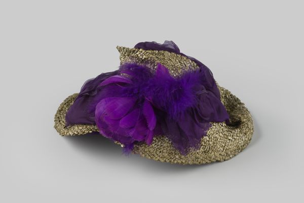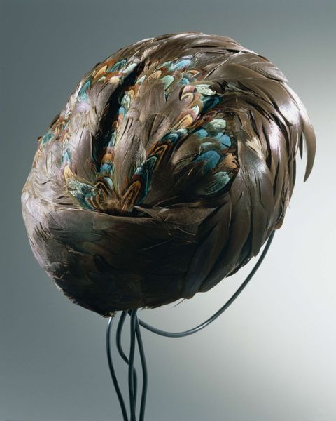 This dark red velvet hat, decorated with a small tuft of dark red and blue ostrich feathers on the left, was designed by Chapeau Erian. I'm interested in the soft mark-making involved in fashion, particularly how the fabric folds and gathers in the body of the hat and how the feathers are arranged. The materiality of the hat is striking; the deep pile of the velvet contrasts so well with the delicate, almost weightless feathers. Look how the light catches the nap of the velvet, creating subtle shifts in tone. The feathers create a kind of halo around the wearer's head, adding to the hat’s dramatic flair. This hat reminds me of the kinds of pieces you might see Elsa Schiaparelli create, with their playful and unexpected combinations of materials. Like Schiaparelli’s work, this hat embraces ambiguity and multiple interpretations, inviting us to see the world with a sense of humor and curiosity.