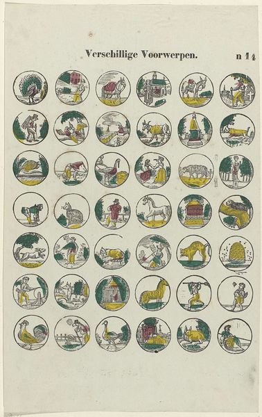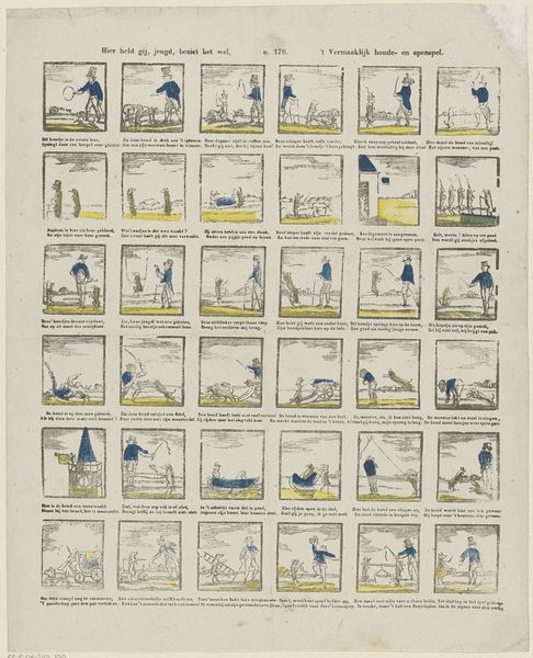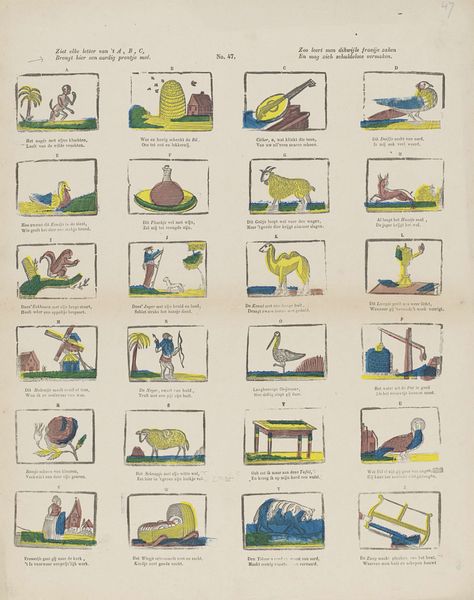 This alphabet sheet, made by Lutkie & Cranenburg, was printed with woodblocks. The letters of the alphabet are each associated with an image, accompanied by a short verse. What’s interesting about this print is the way it brings together the world of childhood education with the visual language of commerce. You see this in the somewhat crude, but still charming, application of color. Blocks were carved for each color separately, and then applied in layers. This was a labor-intensive process, but also one that allowed for mass production and, therefore, wide distribution. Consider the amount of handiwork, multiplied by the quantity of prints that would have been made. The result has a direct, accessible quality, in keeping with its intended audience. By recognizing the means of production here, the layers of making, we gain insight into Dutch culture and commerce, and the way they shaped even the simplest learning tools.