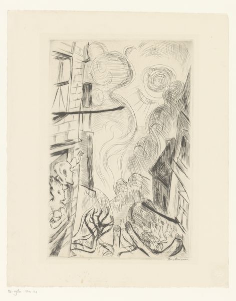 This is Karel Petrus Cornelis de Bazel's print, "Argonauten: manlijk en vrouwlijk vuur." The block print deploys a striking contrast of light and dark, immediately drawing us into its mystical scene. A central, almost spectral figure stands with outstretched arms, light radiating from their head. This figure appears to be entwined with serpentine forms, positioned above two smaller, kneeling figures on either side. The composition is rigidly symmetrical. This symmetry lends the piece an air of balance and ancient ritual. The artist uses stark lines to delineate forms, simplifying the figures and objects into almost archetypal representations. This stylistic choice emphasizes the symbolic nature of the imagery, moving away from literal representation toward deeper, perhaps esoteric meanings. Notice how the limited tonal range further abstracts the scene, reducing everything to essentials. This simplification encourages us to look beyond the surface and contemplate the underlying structure of the composition. De Bazel seems to explore themes of duality and transformation, inviting us to interpret the dynamic interplay between male and female, fire, and form. This print invites ongoing reflection on the interplay between visual elements and symbolic meaning.