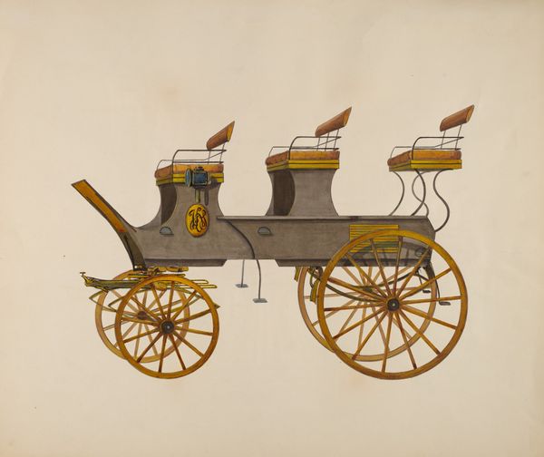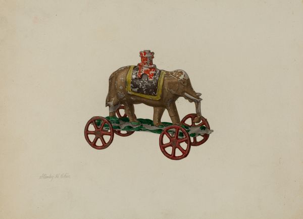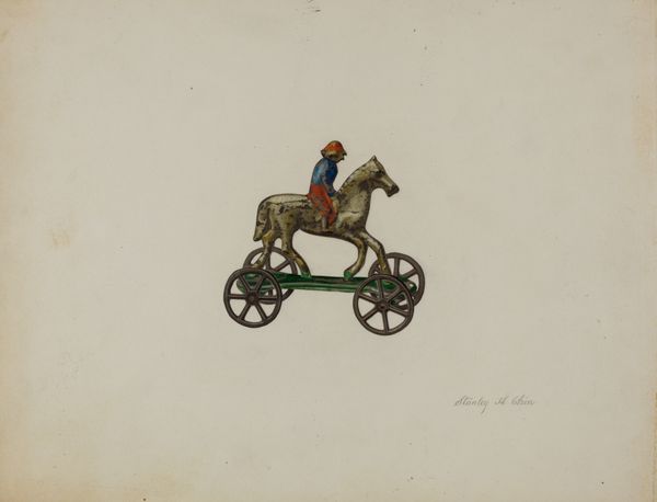 Curator: This watercolor and colored pencil drawing, simply titled "Toy Fire Engine", was created between 1935 and 1942 by William Spiecker. Editor: It's delightful. A little melancholic too, if I’m honest. It's a rendering of a child's toy, yet somehow it feels weighty. Curator: Consider the materials Spiecker employed – colored pencil and watercolor. It appears he selected readily available, affordable media to meticulously represent a manufactured object. Editor: Precisely! Notice the horses in mid-gallop, almost mythic in their painted energy. It speaks to a kind of heroic ideal, the volunteer fire brigade rushing to save the day! Fire as a symbol, historically…it purifies, but also devastates. Curator: Good point. Also, the materiality of the toy itself – likely made of cast iron, mass-produced. The image gives us clues to production practices, but is set against this…nostalgic vision you describe. Editor: And note how he captured the toy's textures. The shiny metal, rendered carefully using layered pigments, gives the whole a feeling of realism—yet it also evokes a yearning, perhaps for a simpler time. The bright reds serve as an almost violent accent amid otherwise muted, serious hues. Curator: That stark contrast mirrors economic disparity of the Depression era—a manufactured playtime ideal rendered against a backdrop of societal strain. Did this toy represent, or even alleviate, some sort of anxiety, do you think? Editor: Toys are powerful tools; their small scale is in dramatic opposition to the massive import of cultural beliefs and practices that they embody, from patriotism to domestic roles. But beyond the obvious, consider the psychological draw of containing such fearsome potency – as symbolized here through the fire. Curator: This dialogue highlights the relationship between childhood aspirations and industrial output. And also the quiet elegance and social complexities held within seemingly simple consumer objects. Editor: Indeed. The image makes you contemplate more than just what appears at first glance—a child's toy. It reminds you that, at its heart, art can embody collective dreams, and our fears.