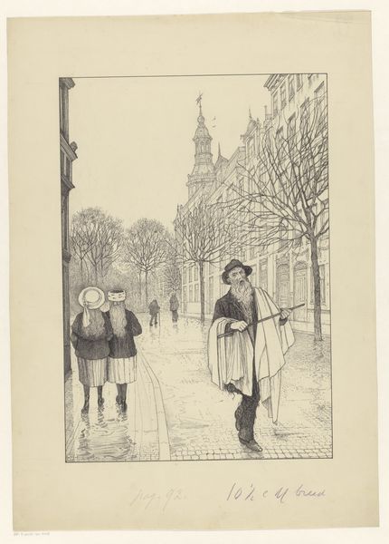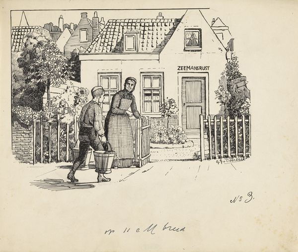 Editor: Here we have "Hond probeert te ontsnappen" by Frans Lazarom, made sometime between 1890 and 1936, rendered with pen and ink. The title translates to "Dog Trying to Escape." I find it charming, almost like a page torn from a storybook. What catches your eye, or maybe even makes you chuckle, when you look at it? Curator: It tickles me, honestly. Lazarom has captured a split-second drama with such economy! I mean, look at that dog, a furry torpedo of thwarted escape! And the two figures flanking the doorway? One, all world-weary indifference with his pipe, the other, a picture of youthful curiosity, poised on his bicycle. Don't you think it's less about escape, and more about the comical juxtaposition of the everyday with the extraordinary, however small? What do you make of that background city view through to the left, which suggests that there is so much the dog is desperate to experience? Editor: I see your point. The contrast is wonderful. The way Lazarom suggests motion with just a few lines, especially the dog's frantic posture, it's so effective. It’s the 'everydayness' versus the inner life of the pet, right? Curator: Exactly! And that sketch-like quality, it lends an immediacy, a sense of witnessing a fleeting moment. Makes you wonder what tale Lazarom might've spun around this very image, wouldn't you agree? Is there something inherently sad, though, that a pet feels locked up, when it should feel part of the domestic furniture? Editor: Absolutely, a melancholic, whimsical note to take away with you...Thanks for illuminating it for me. Curator: My pleasure! I leave this one with a bit more affection in my heart for my scruffy mutt. It has also opened my eyes to the more melancholic existence some pets must endure behind locked doors. Art does the best job when revealing emotions.