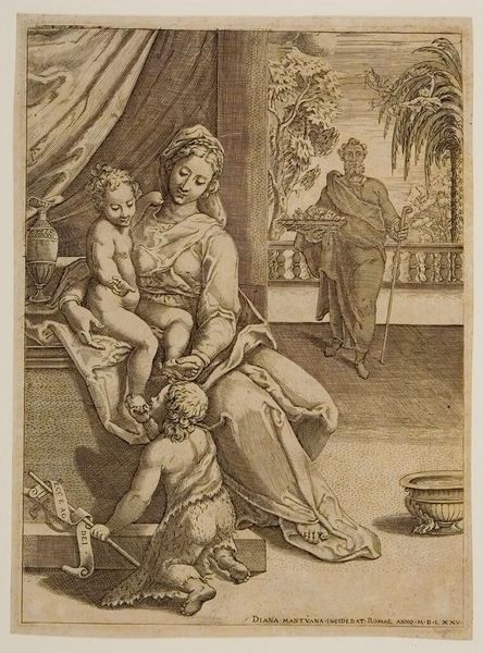 Curator: This is Agostino Veneziano’s "Holy Family with Two Angels." Notice the Madonna, centrally placed, holding the Christ child. What strikes you about it? Editor: It's immediately striking how the artist renders the figures; they seem so weighty, almost earthbound, despite the presence of angels. Curator: Yes, and consider the weight of the symbolic language. The angels, traditional symbols of divine intervention, are here almost like attendants, witnessing a deeply human scene. The child, grasping what appears to be a cross. Editor: It's fascinating to think about the politics of domesticity represented here, too. Mary, rendered as both maternal and divine, becomes a powerful figure within the religious and social structures of the time, even in her apparent submission. Curator: Absolutely. And the composition—the careful arrangement of bodies and gazes—it speaks to the enduring need for images that mediate between the human and the divine. Editor: Ultimately, the artwork speaks to the struggle for power and recognition that women experience even within the ostensibly holy space of the family. Curator: It is an intricate depiction that continues to invite reflection on the roles we enact and the myths we perpetuate. Editor: Indeed, it makes you consider how sacred stories are always entangled with social power.