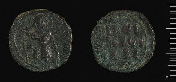 Editor: This object is called Anonymous Follis, its artist is unknown, and it’s currently at the Harvard Art Museums. It's fascinating to consider how this small coin, worn with age, once held economic and perhaps even symbolic weight. What deeper meanings might be embedded in its imagery? Curator: The Anonymous Folles are powerful examples of Byzantine appropriation of iconographic language. Consider the figure on the obverse: Christ, but depicted in a style that deliberately recalls imperial portraiture. What does that visual link evoke? Editor: It suggests a merging of spiritual and earthly power, but I'm curious about the anonymity implied by the title. Curator: Precisely. Anonymity shifts focus. It's less about the Emperor's fleeting power and more about the enduring image of Christ Pantokrator, a visual testament to an eternal authority. The image outlives any ruler. What do you make of that concept in our modern world? Editor: That’s a profound point. It makes me think about how certain symbols endure while the individuals associated with them fade into history. Curator: Indeed. These coins prompt reflection on the complex relationship between image, power, and belief, revealing cultural continuities across centuries.