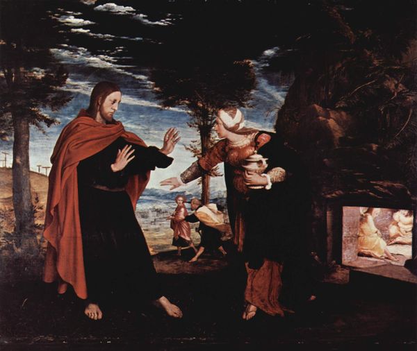 Curator: Guido Reni painted this oil on canvas, Saint Francis deadened with an angel musician, around 1607. Editor: The painting has an immediate somber feel. The use of chiaroscuro creates an intense contrast between the light and dark areas, emphasizing the reflective mood. Curator: Absolutely. This work exists at a key historical intersection. Consider the socio-political anxieties of the early 17th century. Religious conflict was rampant. This painting can be viewed through the lens of Catholic reform and the increased emphasis on personal piety. The iconography is not simply about religious devotion, it reflects an era grappling with societal transformation. Editor: The composition directs our focus. Francis's downward gaze and slumped posture lead us directly to the skull—a strong Vanitas symbol. Note how the angel's light and flowing robes visually contrast with the earth tones and rigid rocks, as the light and the movement emphasizes Francis, with all of his earthiness, even at the last moments of earthly consciousness. Curator: Saint Francis was a liminal figure—he lived both in the world, and outside of it. Reni may have subtly used that positioning to call into question conventional notions of social structures. Perhaps the artist considered if those in poverty should have equitable distribution, despite the views held by the aristocracy at the time. It serves as a reminder to confront the hierarchies deeply entrenched in societal structures. Editor: Indeed. While such context surely enhances the interpretation, I’m still drawn to the technical mastery, and particularly the harmony between the contrasting shapes and the ethereal glow Reni achieves. This creates an atmosphere of sublime contemplation. Curator: Examining art through the perspective of gender and race will perhaps enable a better awareness and appreciation of inclusivity in the artistic landscape. That being said, considering the artistic landscape requires nuance. Thank you for highlighting some key structural qualities that might move us closer to a better understanding of this painting. Editor: And thank you for the context that underscores a much richer art appreciation!