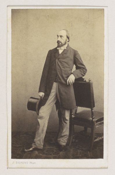 Curator: Here we have a photographic portrait from 1861 by Joseph Dupont titled "Portret van de beeldhouwer Jozef Geefs, ten voeten uit," or "Portrait of the sculptor Jozef Geefs, full-length". Editor: My immediate sense is formality; he seems captured in a pose, the lighting staged, and his clothing meticulously arranged for the photograph. It's almost austere. Curator: Well, certainly intended to project an image of bourgeois respectability. Geefs' posture, hand on hip, isn’t simply casual. It's a classic heroic stance, associating him with ideals of creative power and intellect, something of a romantic hero even. Editor: Right, but the material conditions of photography here interest me. Think about the equipment of that time, the development process; that warm sepia tone hints at albumen printing, which relied on egg whites and silver salts. It represents such an interesting moment in democratized image production. Curator: Indeed. But the fact it’s a *portrait* speaks volumes. Even within this relatively new medium, there’s an effort to capture not just likeness, but the subject's status and cultural significance. The drape to his side suggests classical sculpture; the carefully arranged coat evokes professional stature. Dupont is consciously linking Geefs to art history and the artistic establishment. Editor: I'd argue that Dupont, too, claims an artist's mantle here. The meticulous darkroom work, the composition...photography was establishing itself not merely as reproduction, but as creative practice. The tonal range and subtle texture make this far more than just a copy. It's about a shift in who controls making images. Curator: Of course. The photo gives dignity, but perhaps even celebrates his likeness and therefore work. A statement piece in itself; as a photograph capturing Geefs the artist it can stand as an evocative art piece of the time in its own right. Editor: Exactly. Think about all those unacknowledged hands preparing the plates, mixing chemicals... the photo's surface belies an intensive workshop system. Curator: Fascinating to look at the photograph this way. It enriches one’s view greatly of Dupont's choice to immortalize another artist through what was then a burgeoning artistic medium. Editor: Agreed. I came thinking simply about materials but am ending up pondering who controlled the means and reasons for his visibility at all.
