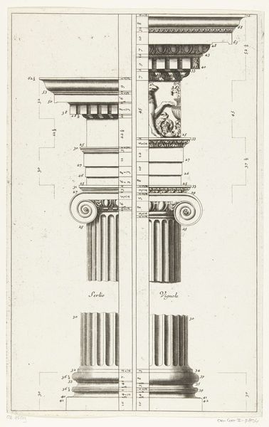 This print of a cornice and column from the Temple of Fortuna Virilis was created by Giovanni Battista Piranesi, likely in the 1750s, as part of his series "Le Antichità Romane." The composition is structured around detailed architectural elements, dominated by the strong verticality of the column on the left. Piranesi employs meticulous lines to differentiate textures and forms, from the smooth column to the ornate cornice. Note the interplay of light and shadow, achieved through fine hatching, which gives depth to the otherwise flat surface. Piranesi uses the semiotic language of classical architecture to invoke the grandeur of ancient Rome. By isolating and magnifying architectural fragments, he invites us to consider the original context and symbolic weight of each component. This detailed study destabilizes our perception of classical ruins, urging us to reconsider their constituent forms and historical significance.